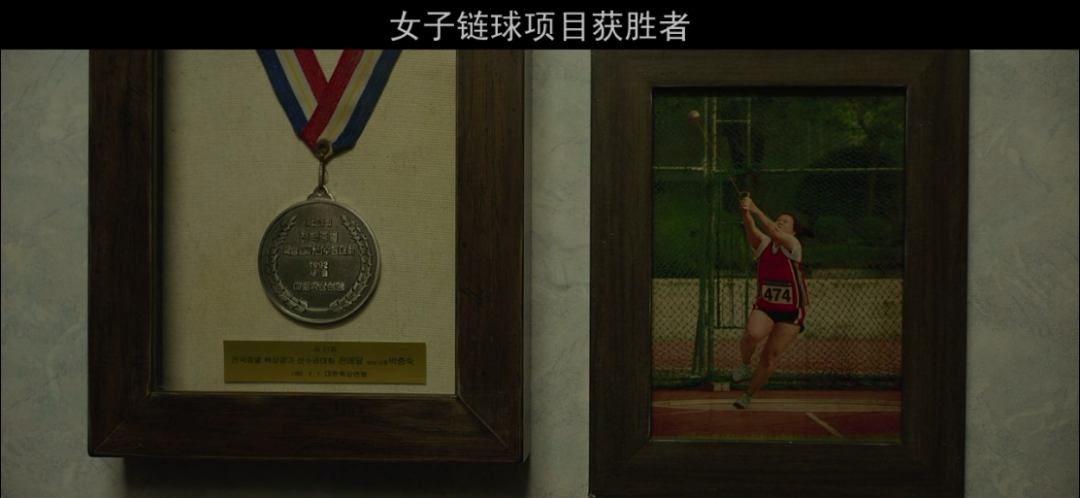 信息量是什么?电影中有一个镜头,墙上挂着女子链球项目的获胜者照片和奖牌。这个地方为何要出现这个镜头?它不是平白无故出现的,后面我们就会看到这家人是不甘于现状的,他们不甘于在地下室过穷困潦倒的生活,向往富人阶级,所以会有虚荣心。女子链球项目获胜者奖牌代表着这家人最顶级的荣耀,这个画面内容就是其中的一个信息点,所以呈现在这里。