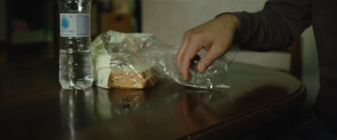 镜头切换到附近,我们看到一只寄生虫,通过一只小小的寄生虫隐喻这家人也是寄生虫,可能别人一个弹指就把他们弹到不知哪里去了。这是一个在美术置景方面非常经典的画面,画面传递出来的信息量非常深刻。