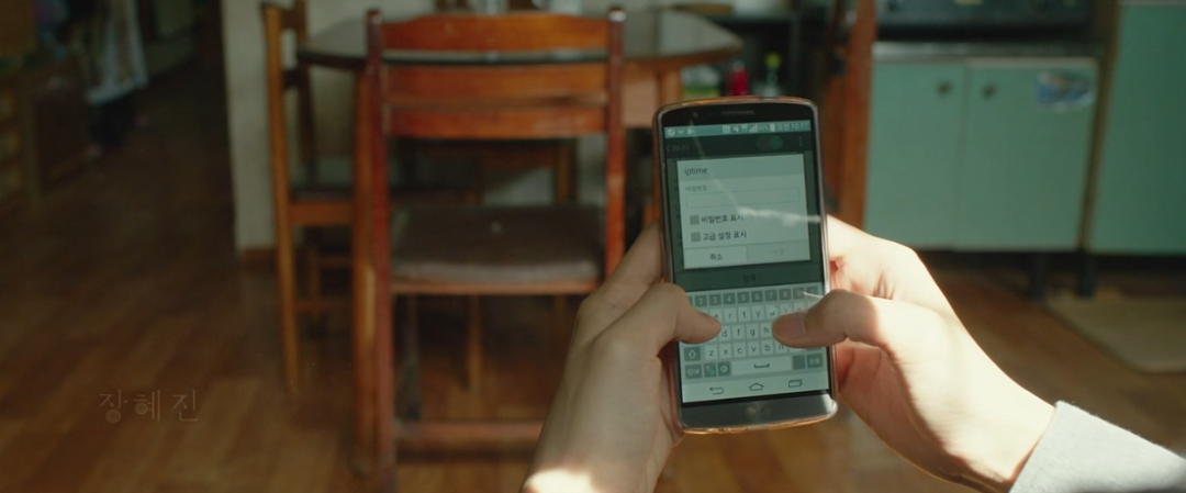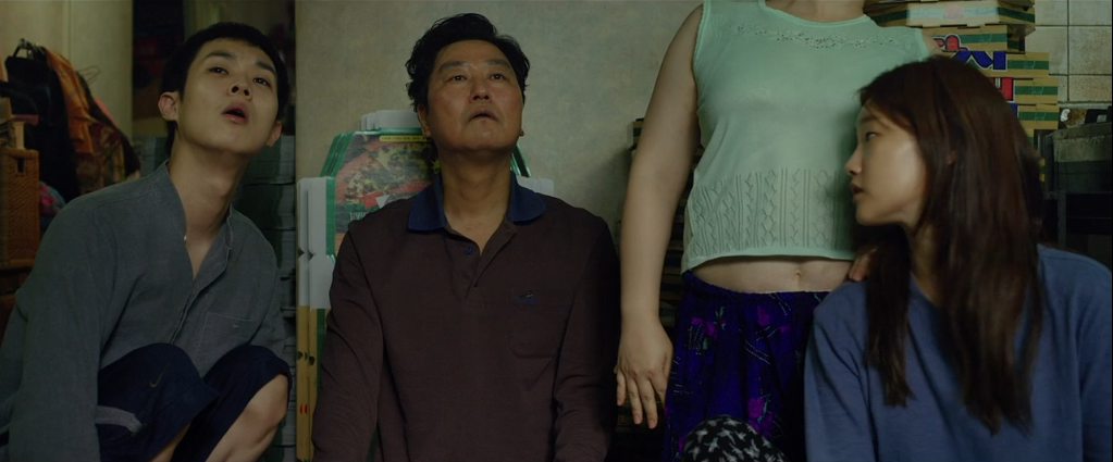 再来看一个客观的镜头运动。男孩在地下室蹭WiFi过程中,父亲建议他把手举高一点,这其实也是隐藏上帝视角的体现,它是非常主观的一个镜头,但很自然地形成了客观镜头运动,这里的镜头运动就是父亲的那句”手举高一点”带出来的。男孩将手举向天花板,也更显示出这家人社会地位低下,隐喻这家人是被全首尔的人踩在脚下的最底层家庭。