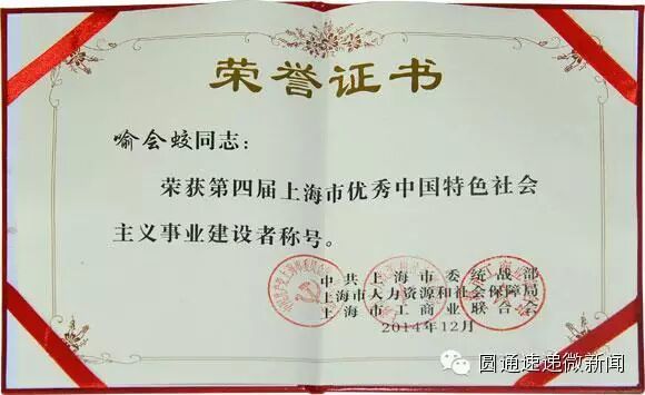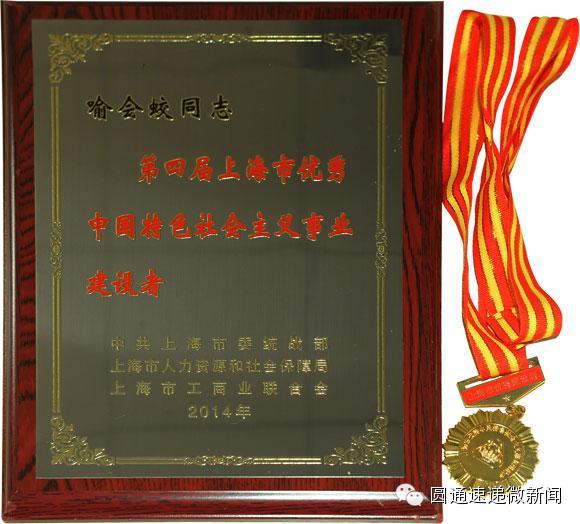 2014年12月4日,第四届上海市优秀中国特色社会主义事业建设者表彰大会在市委统战部二楼会议中心隆重召开。会上,圆通速递董事长喻渭蛟荣获由中共上海市委统战部、上海市人力资源和社会保障局、上海市工商业联合会联合颁发的“第四届上海市优秀中国特色社会主义事业建设者”称号。