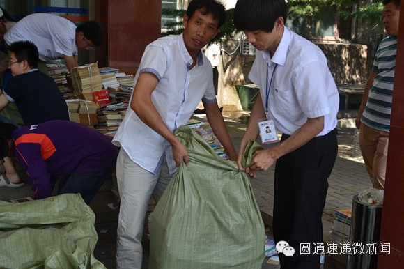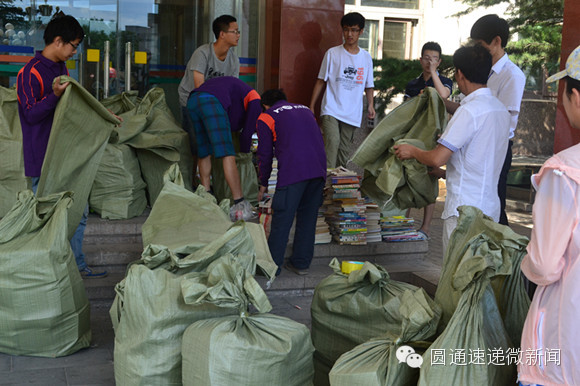 7月12日,圆通北京区域同事汪浩和北京昌平城区分公司人员将政法大学筹集到的书籍整理、打包、装袋,准备运往山西和河南。