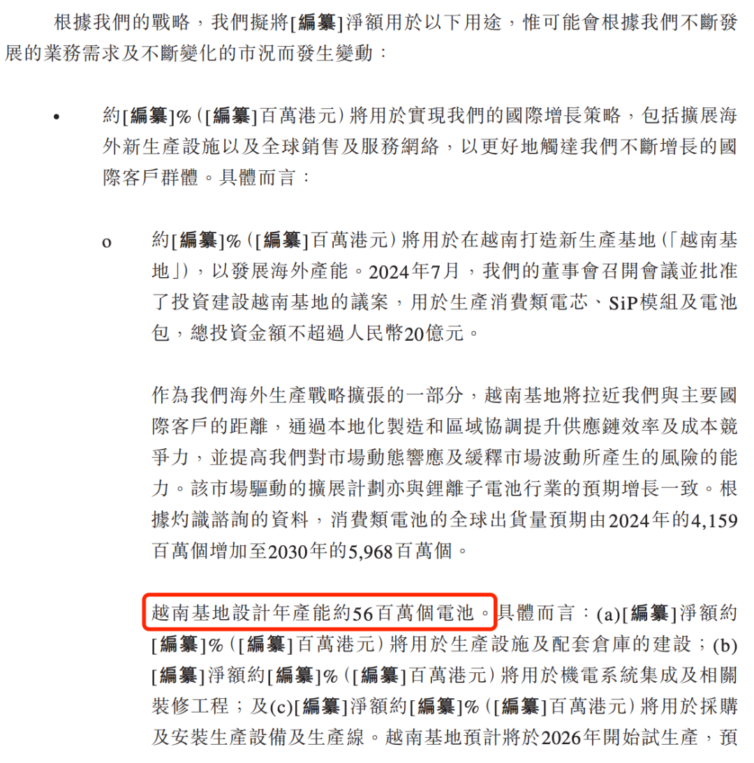 但是,在提交给港交所的招股书中有更具体的目的,募资将用于在越南打造新生产基地、扩张全球销售及服务网络、研发、数字化及数智化升级、投资或收购上下游业务,其中越南基地设计年产能56万个电池。