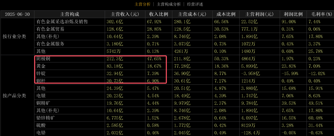 从上半年公司财报中的产品分类看,白银有色第一大业务是阴极铜,营收占比将近48%;第二大业务是黄金,营收占比将近19%;第三大业务是锌锭,营收占比超过7%;第四大业务是铜杆,营收占比将近7%。