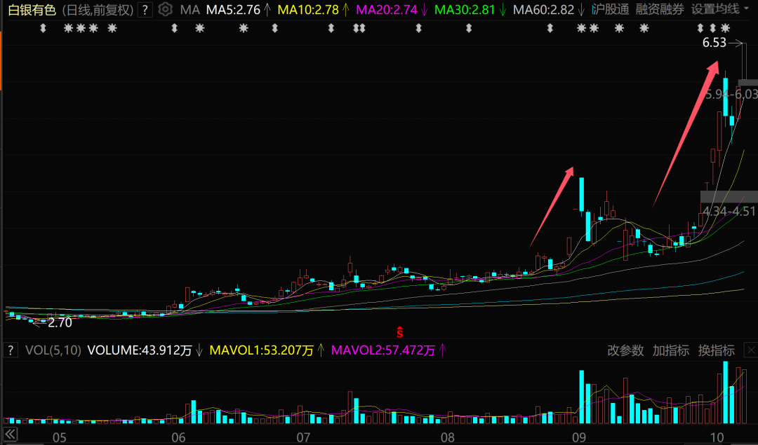 10月9日、10日、13日、16日、17日,白银有色均出现涨停,7个交易日内多达5个涨停。