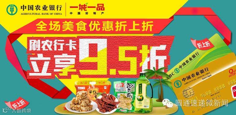 “农”情时刻,美味相随,“食”惠折上折!农业银行首度携手圆通旗下美食特产平台【一城一品】,为农行持卡用户提供消费立享9.5折优惠活动。【一城一品】凭借圆通速递强大的物流终端,搜罗全国各地特色美食,坚持产地直送,确保产品新鲜实惠。即日起至2014.9.31,与半价、优惠券抵扣、满减、包邮等活动均可同时使用,折上折的“食惠”你怎能错过?还不赶紧来“农”情一“夏”!!