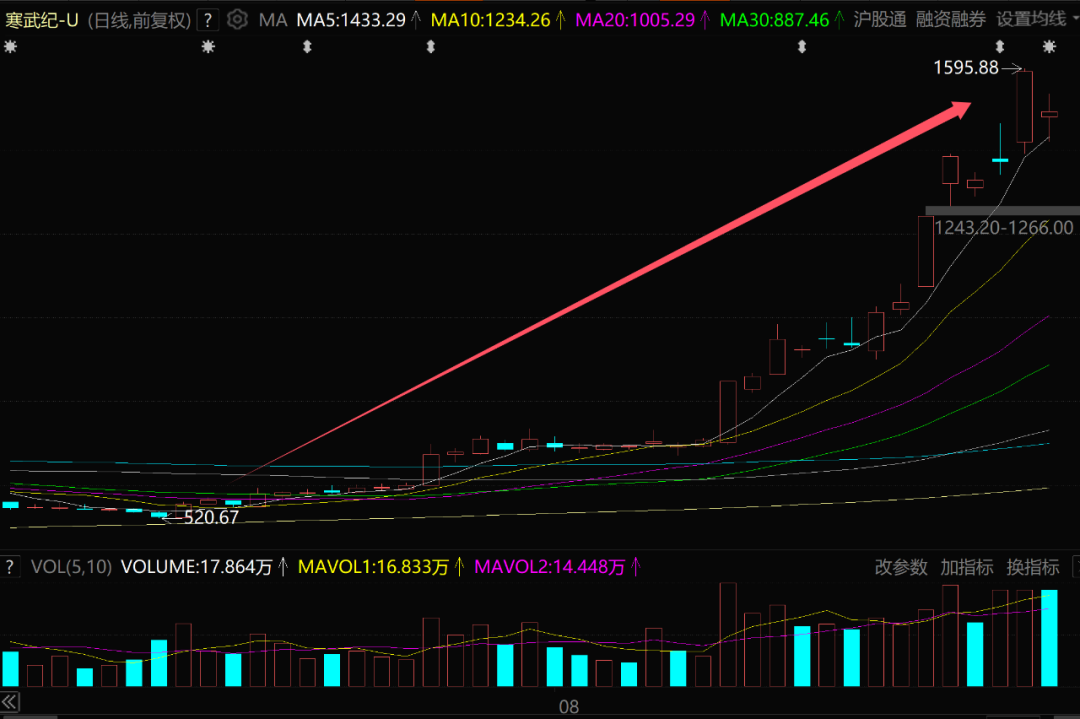 8月12日、22日,寒武纪均出现20cm大号涨停,8月28日,寒武纪再度暴涨15%以上,股价逼近1600元,正式超越茅台成为“A股股王”,市值也突破了6600亿。