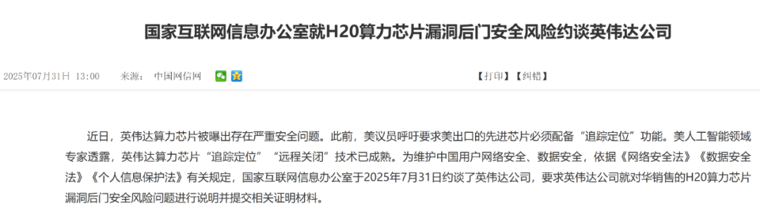 7月底,互联网监管部门就H20芯片的漏洞后门安全风险约谈英伟达公司,要求其对安全风险进行说明并提交相关证明材料。