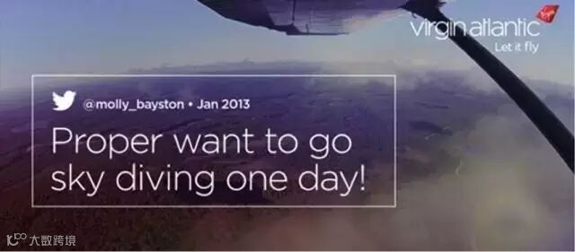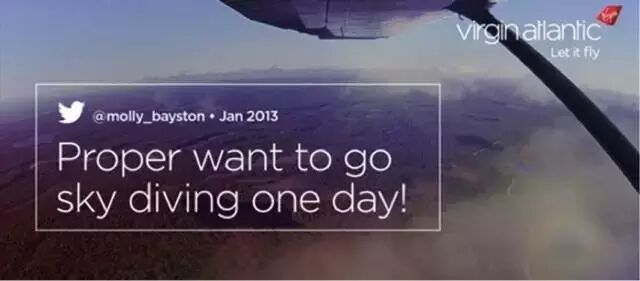 英国维珍大西洋航空公司会查看用户的推特信息流,即兴挑选一些关于“说走就走的旅行”的内容,让用户梦想成真。比如说,用户发布了“总有一天我要去...”这样的内容,维珍就让“总有一天”变为“今天”。
