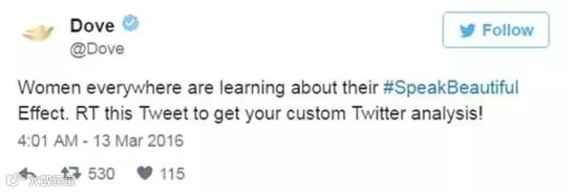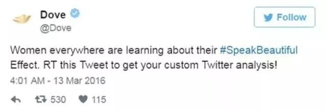 当用户转发品牌的状态后,会得到一份关于自己在这个平台上展现出来的思想状况的报告。报告中,人们能清楚地看到自己在推特上发送的关于“美丽”这个话题的正面信息与负面信息的比例。