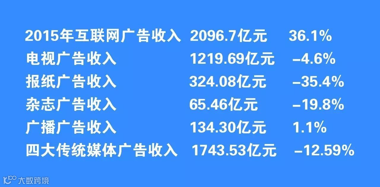 数据显示,2015年中国互联网广告市场规模达2096.7亿元,同比增长36.1%;而2015年电视广告收入为1219.69亿元,同比下跌4.6%;报纸为324.08亿元,同比下跌35.4%;杂志为65.46亿元,同比下跌19.8%,广播为134.30亿元,同比上涨1.1%;2015年广电报刊四大传统媒体行业的广告之和为1743.53亿元,低于互联网广告市场的规模。
