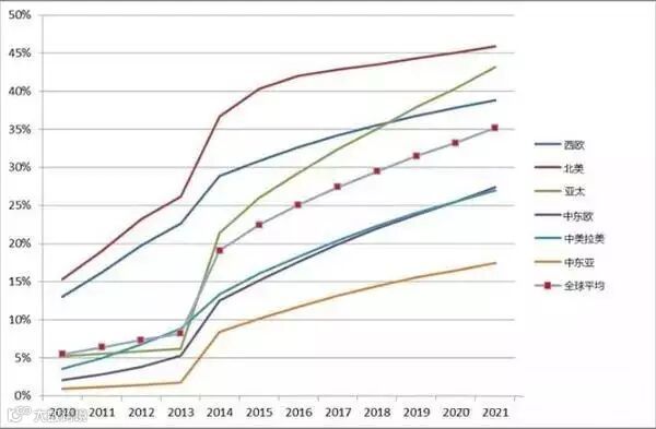 2010年-2021年全球移动视频用户渗透率(按区域)