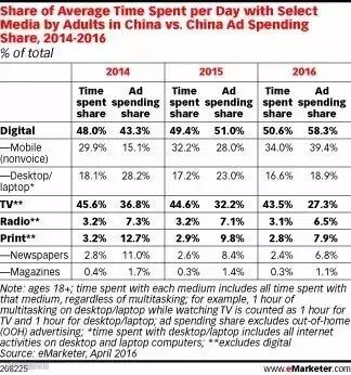 虽然比先前的预测少慢,向互联网的转变是确定的,这也反映在广告商的行为上。2016年在中国网络媒体占广告商预算的58.3%,超过了时间份额。