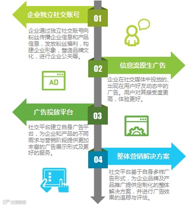 从社交网络广告产品来看,我国社交网络营销目前最主要的创新营销形式分为企业独立社交账号、信息流原生广告、社交平台广告投放平台、整体营销解决方案四种形式。
