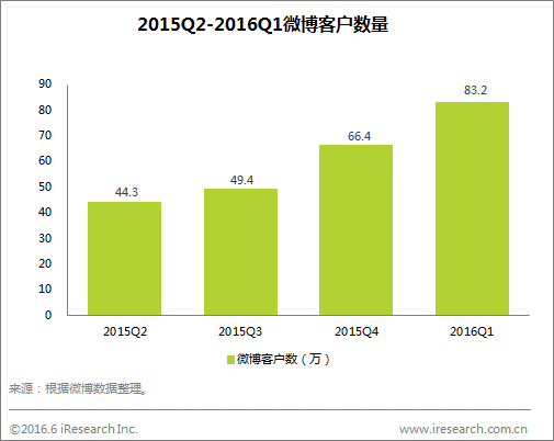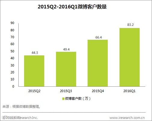 与此同时,企业本身也越来越意识到社交网络营销的重要性。根据艾瑞整理Digiday数据显示,2015年美国61%的企业对社交营销中的原生广告与内容营销极为看重。根据微博数据显示,2016Q1微博客户数量为83.2万,与2015Q1相比高出近一倍。社交网络营销表现形式与推广方式的不断创新,是企业转变传统思维、将注意力与投入逐渐向社交网络营销倾斜的主要原因。