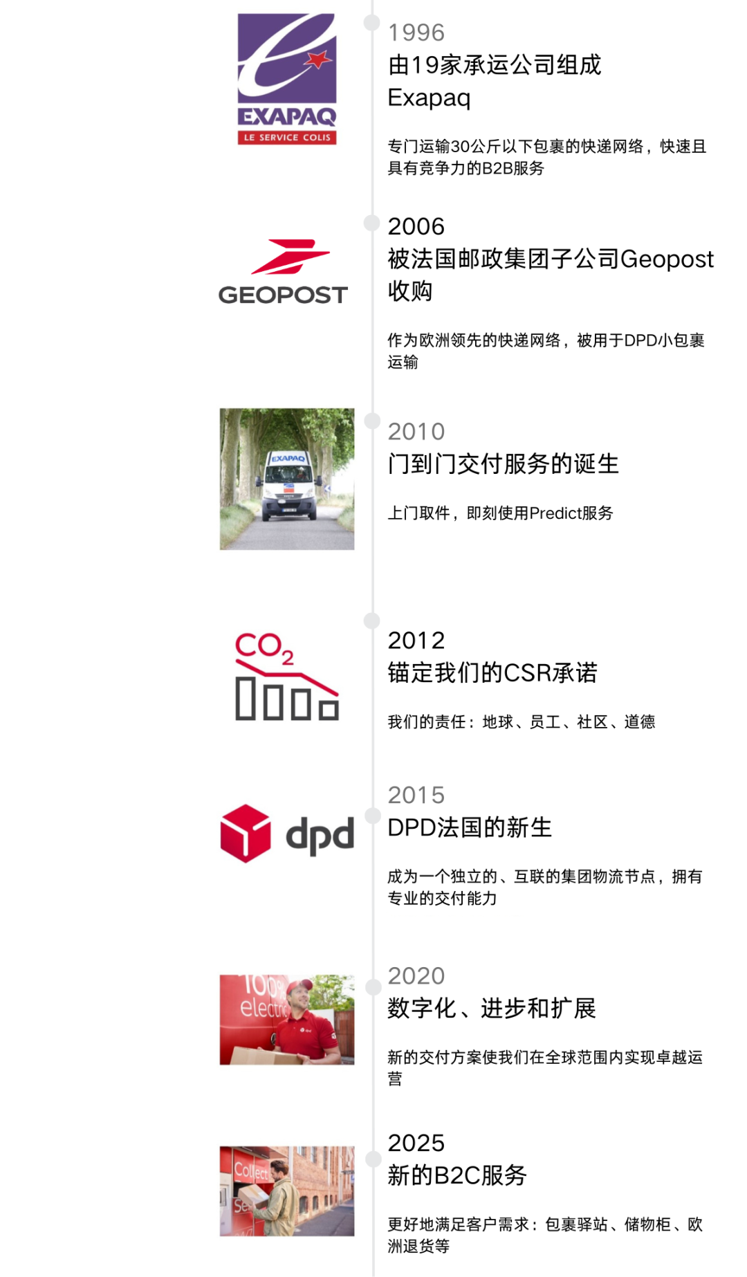 自1995年成立Exapaq以来,DPD法国拥有19家运输公司,已发展成为法国重要的包裹递送公司。DPD法国于2006年加入法国邮政家族,并于2015年更名,并不断扩大。如今,DPD法国拥有2700名员工,80家代理商,5个分拣中心和5000多条配送路线,2024年处理了1.035亿个包裹。