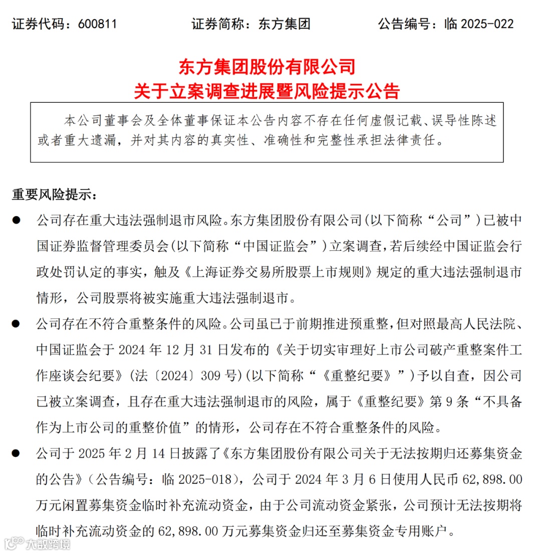 东方集团也发布公告,称存在重大违法强制退市风险。