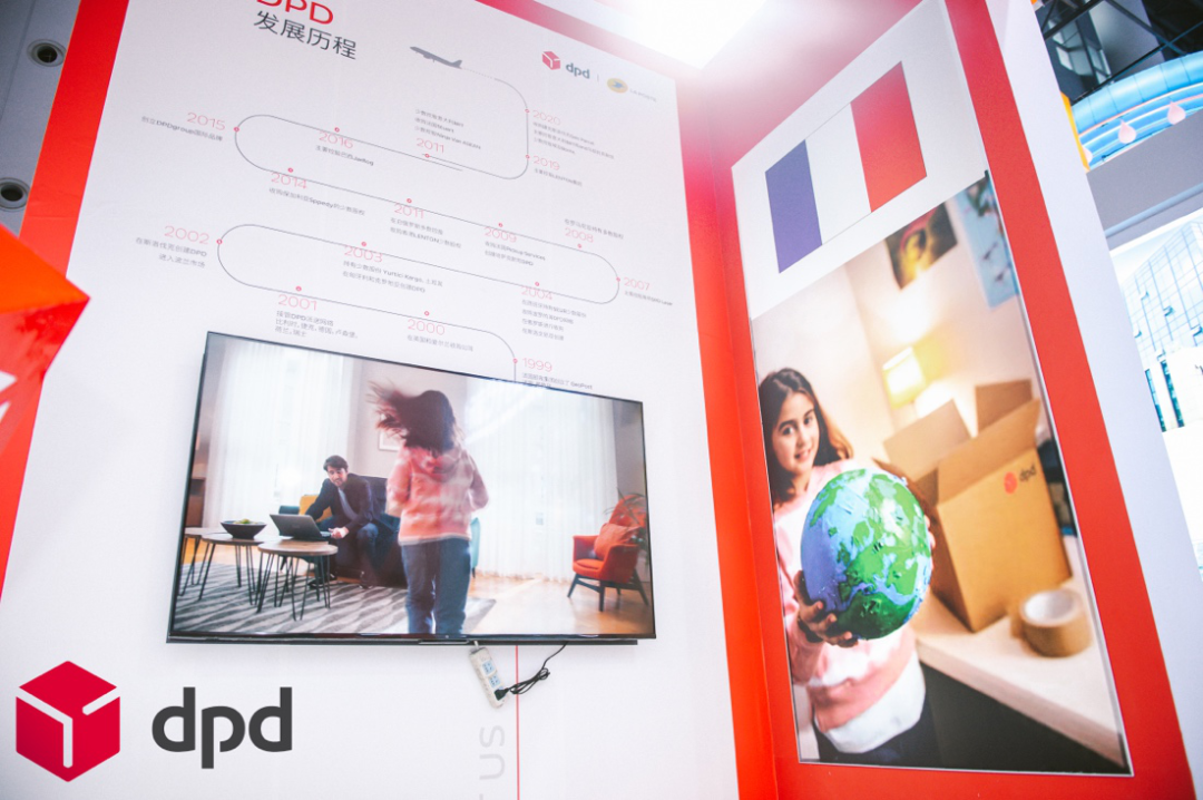 其中展台上播放的宣传影片,涵盖DPD集团的国际版图扩张、抗疫成就、先进智能化快递技术展示以及DPD “We all share the same address.”先进的绿色递送环保理念。