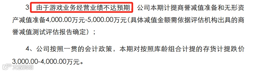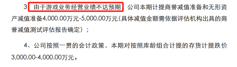 针对这个业绩情况,拓维信息给出的理由是,因业务发展需要,银行借款规模增加、技术人员储备增加导致费用增加,以及项目运营情况未达预期计提商誉、无形资产等减值准备导致公司净利润亏损。其中,由于游戏业务经营业绩未达预期,计提商誉、无形资产减值4000万-5000万,存货计提跌价准备3000万-4000万。