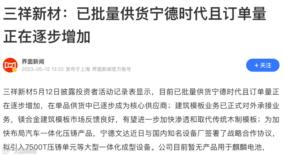 这种联系的路径或许是,小米SU7 Ultra使用的是宁德时代的三元锂电池,而三祥新材与宁德时代在2020年就开始合作生产镁合金电池端板等结构件,2023年5月已经批量给宁德时代供货。