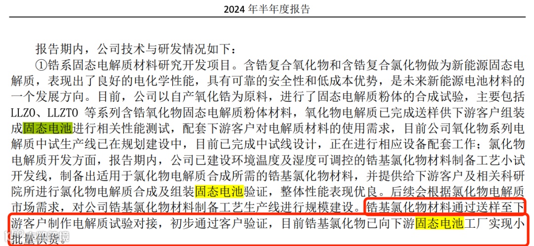 到2024年半年报时,关于锆系固态电解质材料研究开发项目,进度已经到了小批量供货阶段。