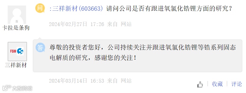 2024年3月的时候,三祥新材曾在互动平台表示,公司持续关注并跟进氧氯化锆锂等锆系列固态电解质的研究。