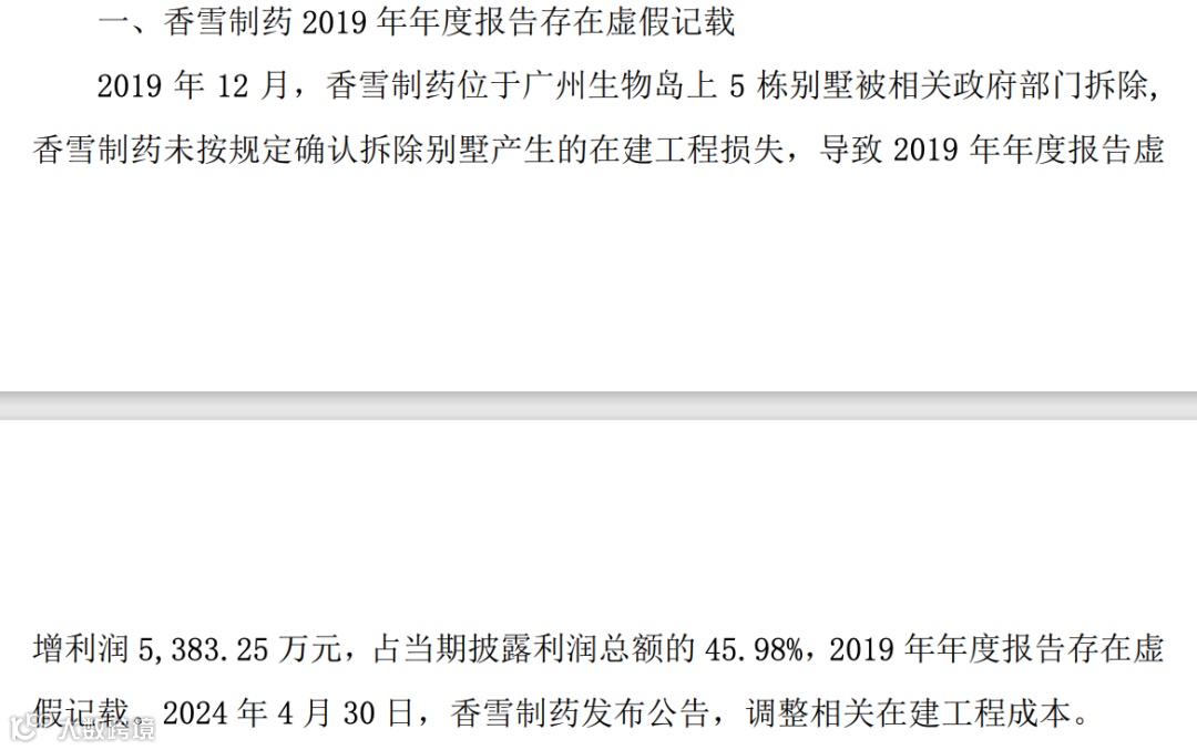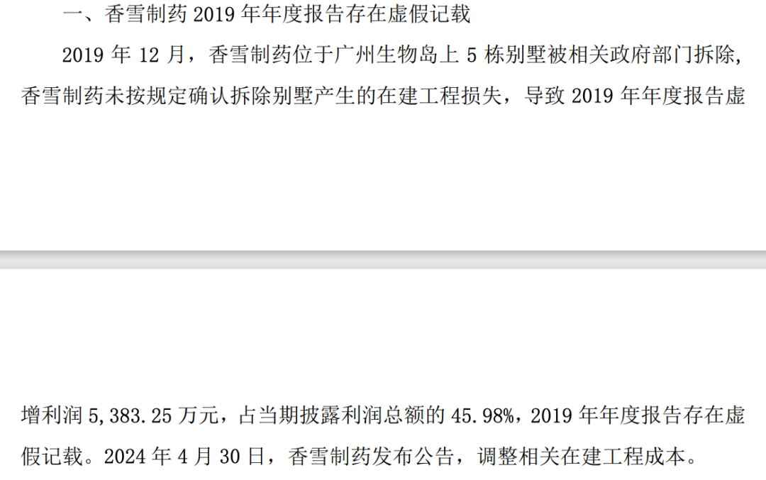 香雪制药财报虚假记载主要是2019年年报,当年香雪制药未按规定确认旗下被拆除别墅产生的在建工程损失,导致年报虚增利润5383.25万,占当期对外披露利润的45.98%。