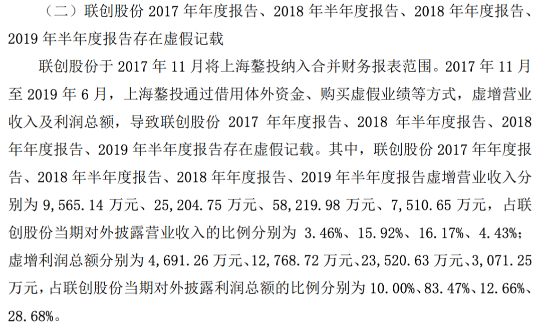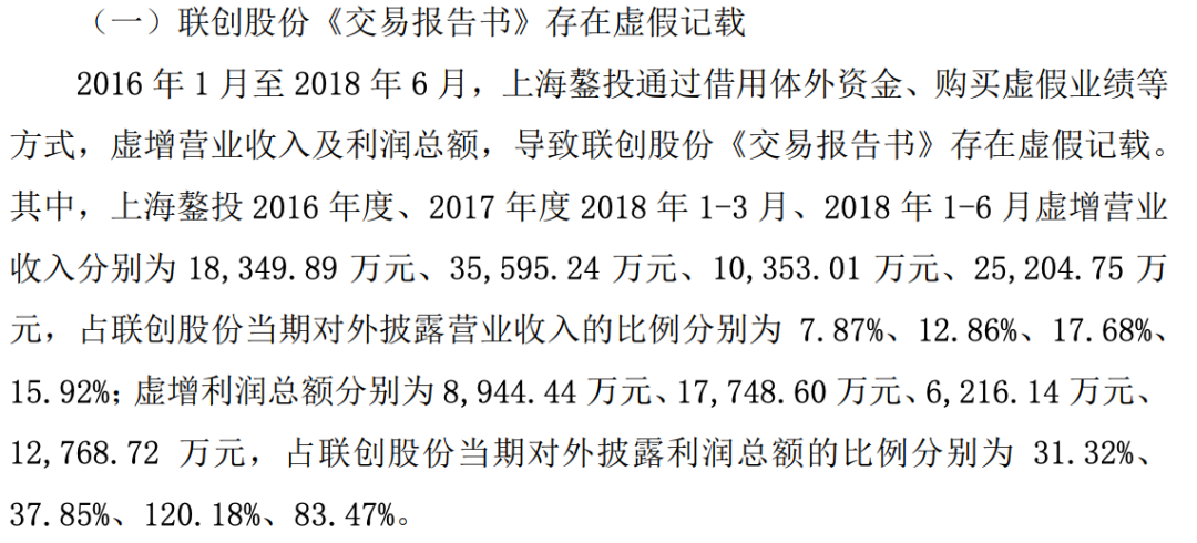 但是,在并表前后,2016年1月-2018年6月,上海鏊投通过借用体外资金、购买虚假业绩等方式虚增营收及利润,累计虚增营收7.91亿,累计虚增利润3.94亿,虚增利润对联创股份产生重大影响。