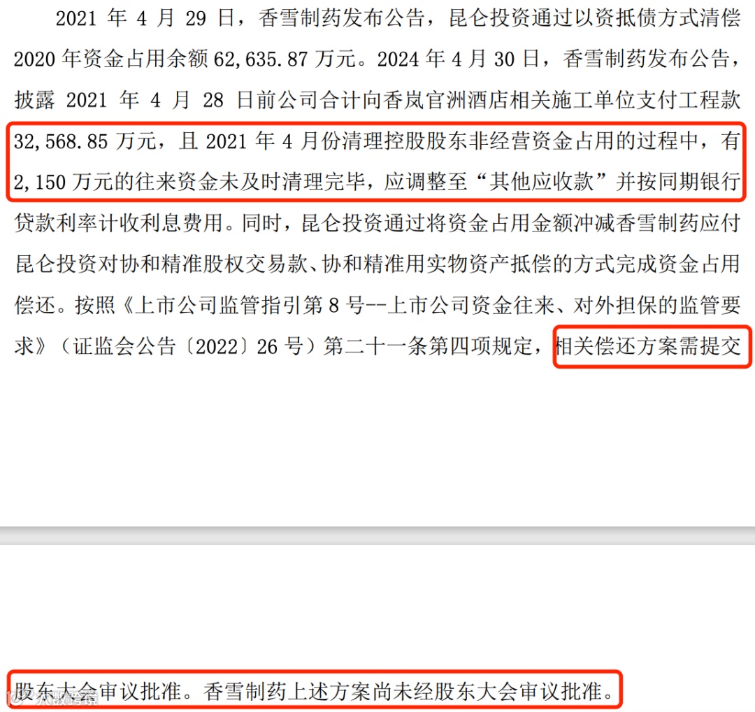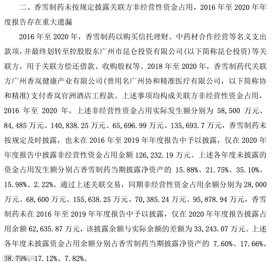 2016年-2020年,香雪制药以购买信托理财、中药材合作经营等名义将相关款项划转至控股股东昆仑投资等关联方,用于偿债、收购等。2018年-2020年,香雪制药又替关联方广州香岚健康支付香岚官洲酒店工程款。