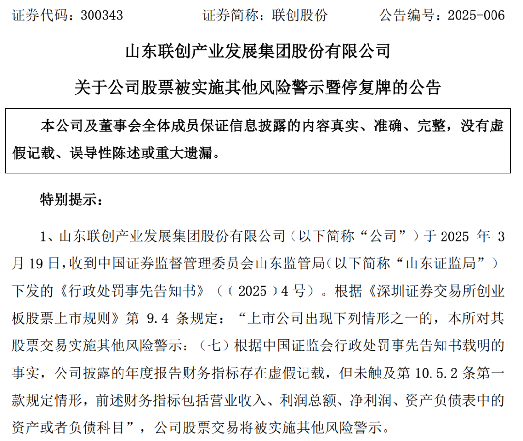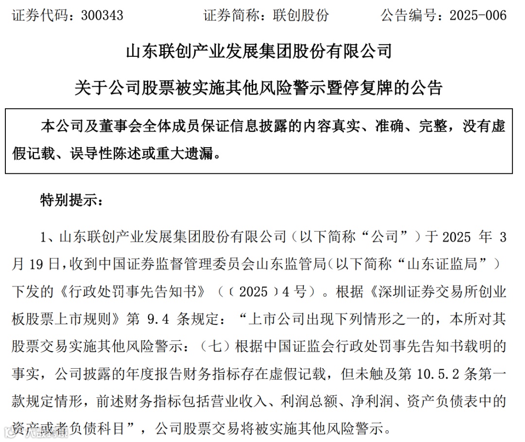 不过,由于未触发财务强制退市规则,公司股票被实施其他风险警示,3月24日停牌1天,自3月25日起股票名称变更为“ST联创”。