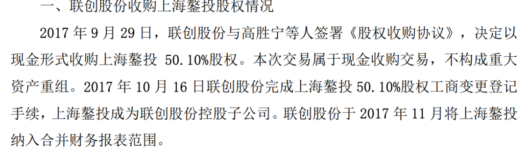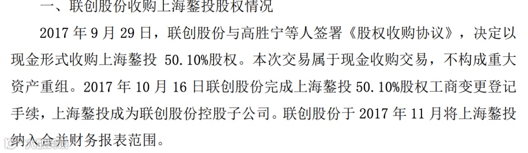 首先是股权收购报告虚假记载。2017年9月29日联创股份公告,拟以现金收购上海鏊投50.1%股权,之后在当年11月将上海鏊投并入上市公司报表。