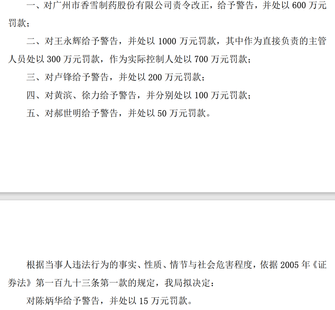 针对香雪制药的种种违规行为,最终上市公司被处600万罚款,实控人王永辉被处以1000万罚款,财务总监卢锋处以200万罚款,其他相关人员被处以15万到100万不等罚款。