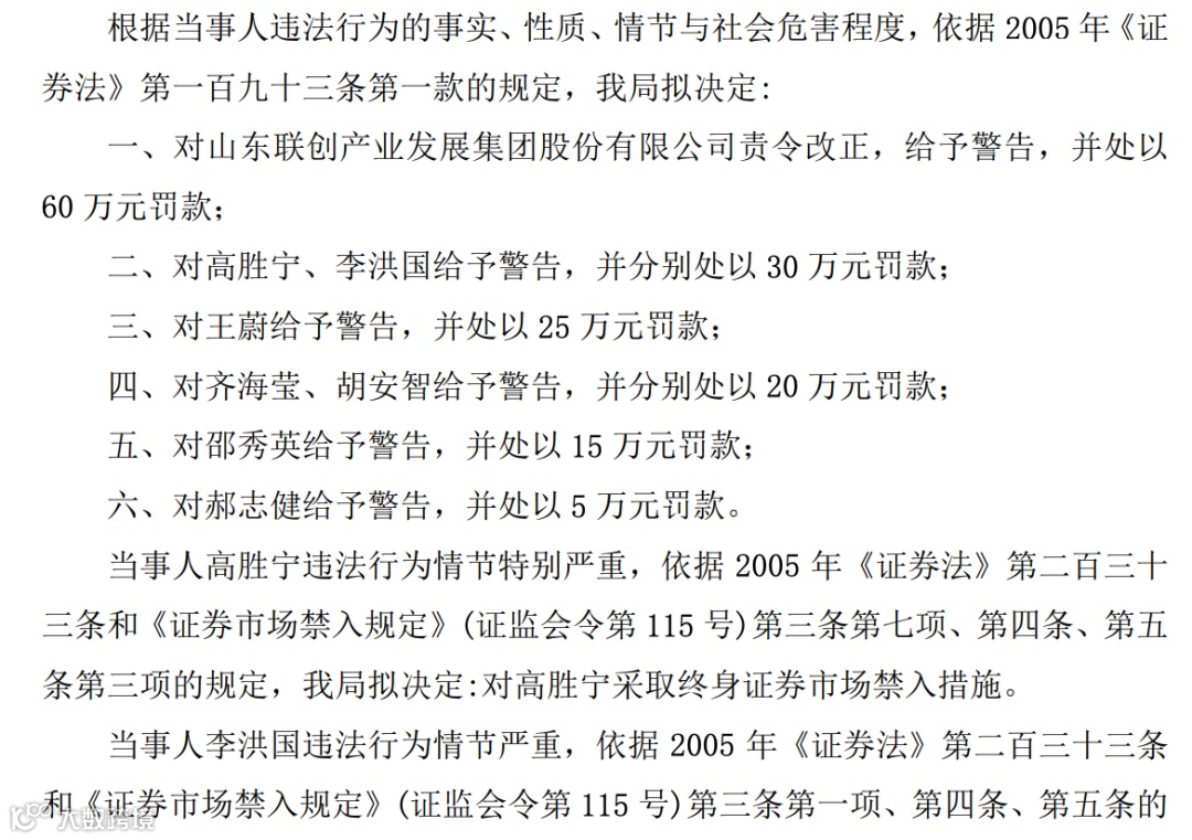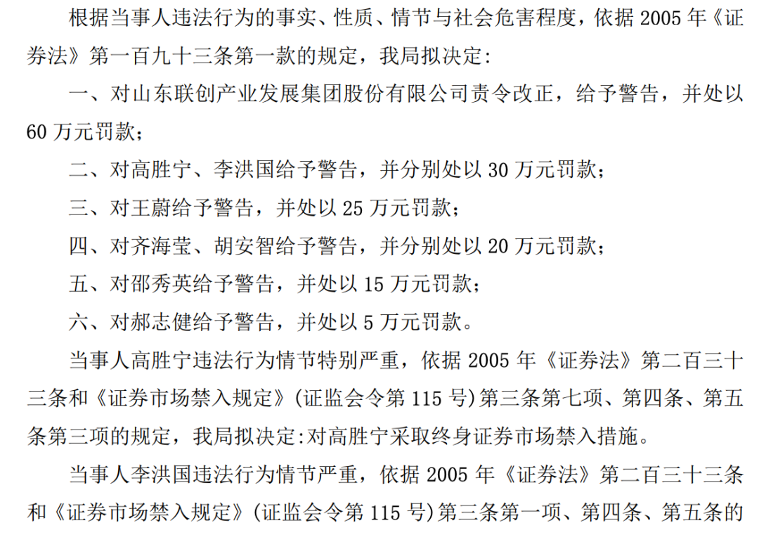 联创股份的这些违法事实,最终被处以60万罚款,所涉相关责任人分别被处以5万-30万不等的罚款。其中,时任董事长李国洪、时任总经理高胜宁分别被罚30万,高胜宁被市场终身禁入,李国洪被市场禁入5年。