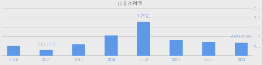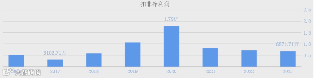 同样的市值价位,对应的欧陆通扣非净利润的估值抬升了很多,原因就是上市之后的欧陆通业绩持续变脸,扣非净利润从2020年的1.79亿降至2023年的6871.71万!