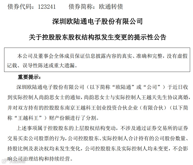 不过,12月24日,欧陆通却发布了一份公告,实控人尚韵思与实控人王越天协议离婚,并对双方持有的控股股东王越科王财产份额进行分割,该事项属于控股股东的上层股权结构变动,不涉及通过证券交易买卖公司股票的行为,公司控股股东、实控人均未变更。