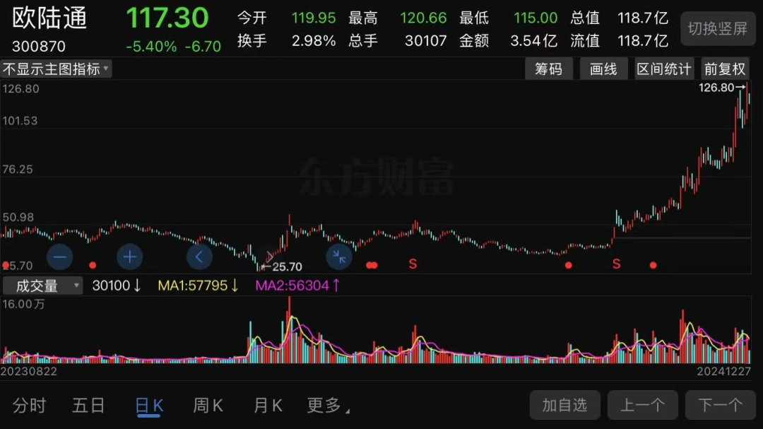 12月20日欧陆通盘中最高价超越上市时创下的114元的高位,当天收盘价113.99元也刚刚达到上市时的最高价114元。
