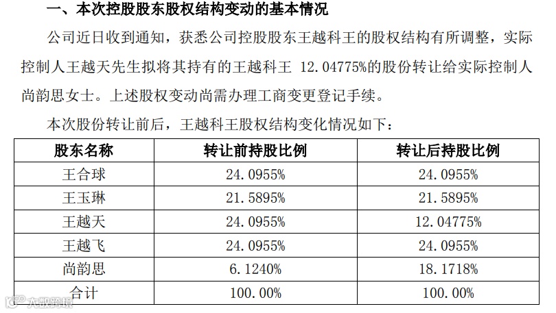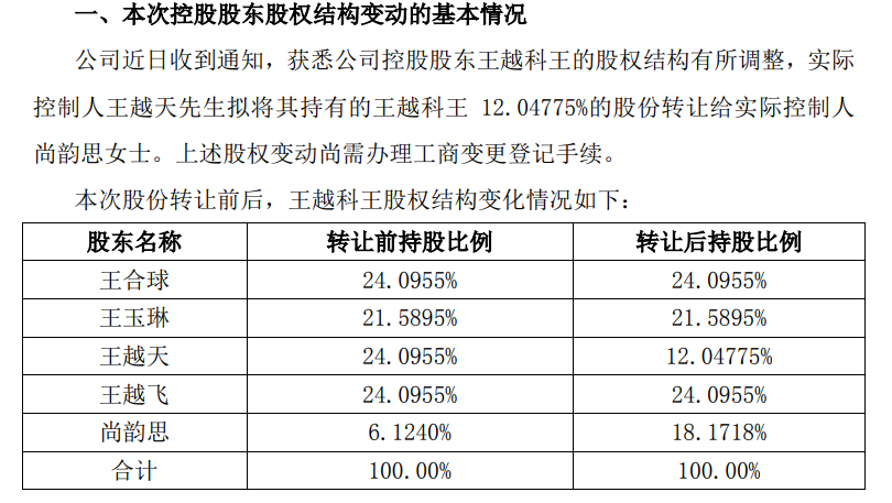 欧陆通公告显示,实控人王越天拟将所持王越科王12.04775%股权转让给实控人尚韵思,股权变更后,王越天持有王越科王股权由24.0995%降至12.04775%,尚韵思持有王越科王股权由6.1240%增至18.1718%。