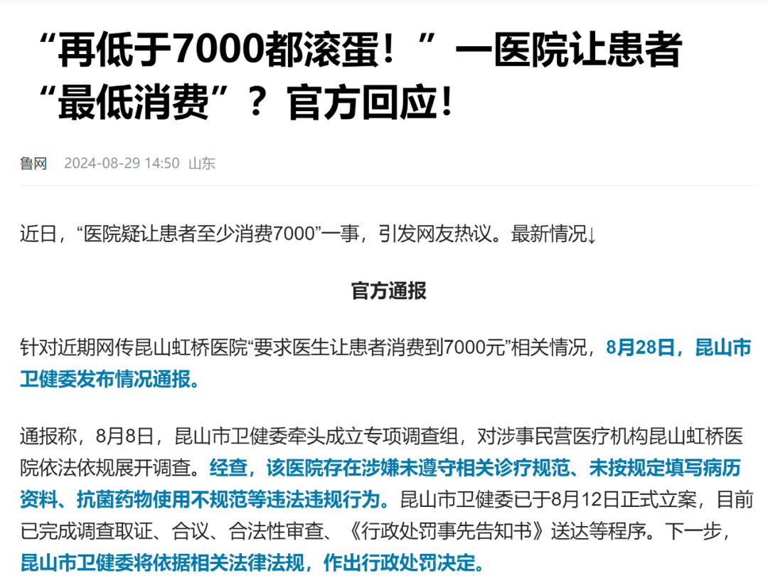 在无锡虹桥医院出事之前,8月份,昆山虹桥医院因网传让患者至少消费7000元而被当地卫健委立案。