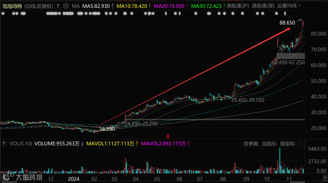 港股的泡泡玛特,今年初的时候不到17港元,而现在涨到了88港元以上,涨幅高达430%。