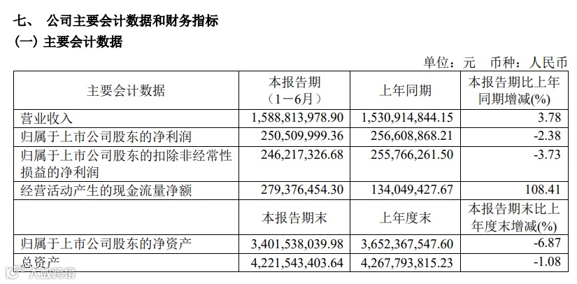 千禾味业半年报显示,营收15.89亿、同比微增3.78%,归母净利润2.5亿、同比下滑2.38%,扣非净利润2.46亿、同比下滑3.73%,净资产同比下降6.87%,总资产同比下降1.08%。好的一点是,经营活动现金流净额大幅增长108.41%。