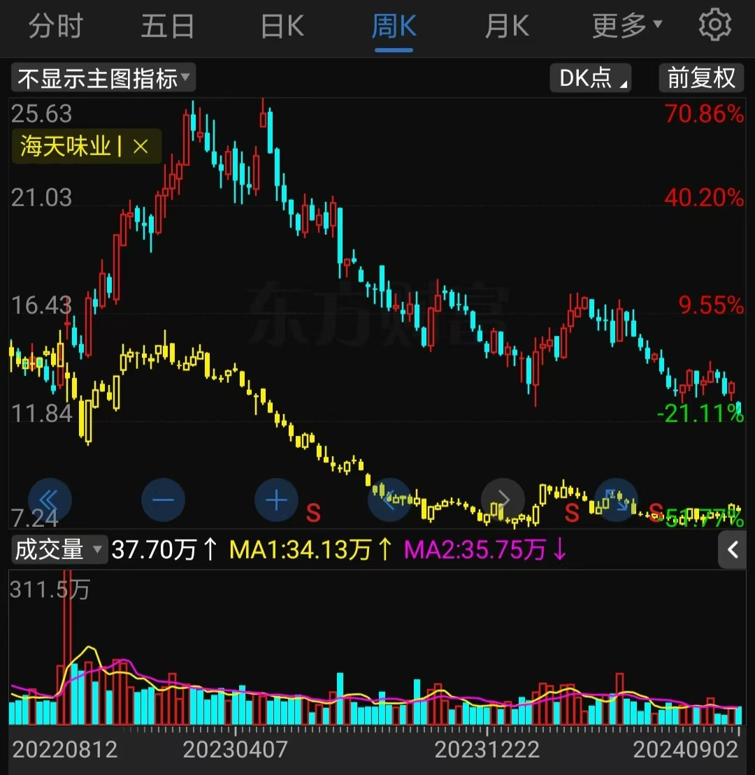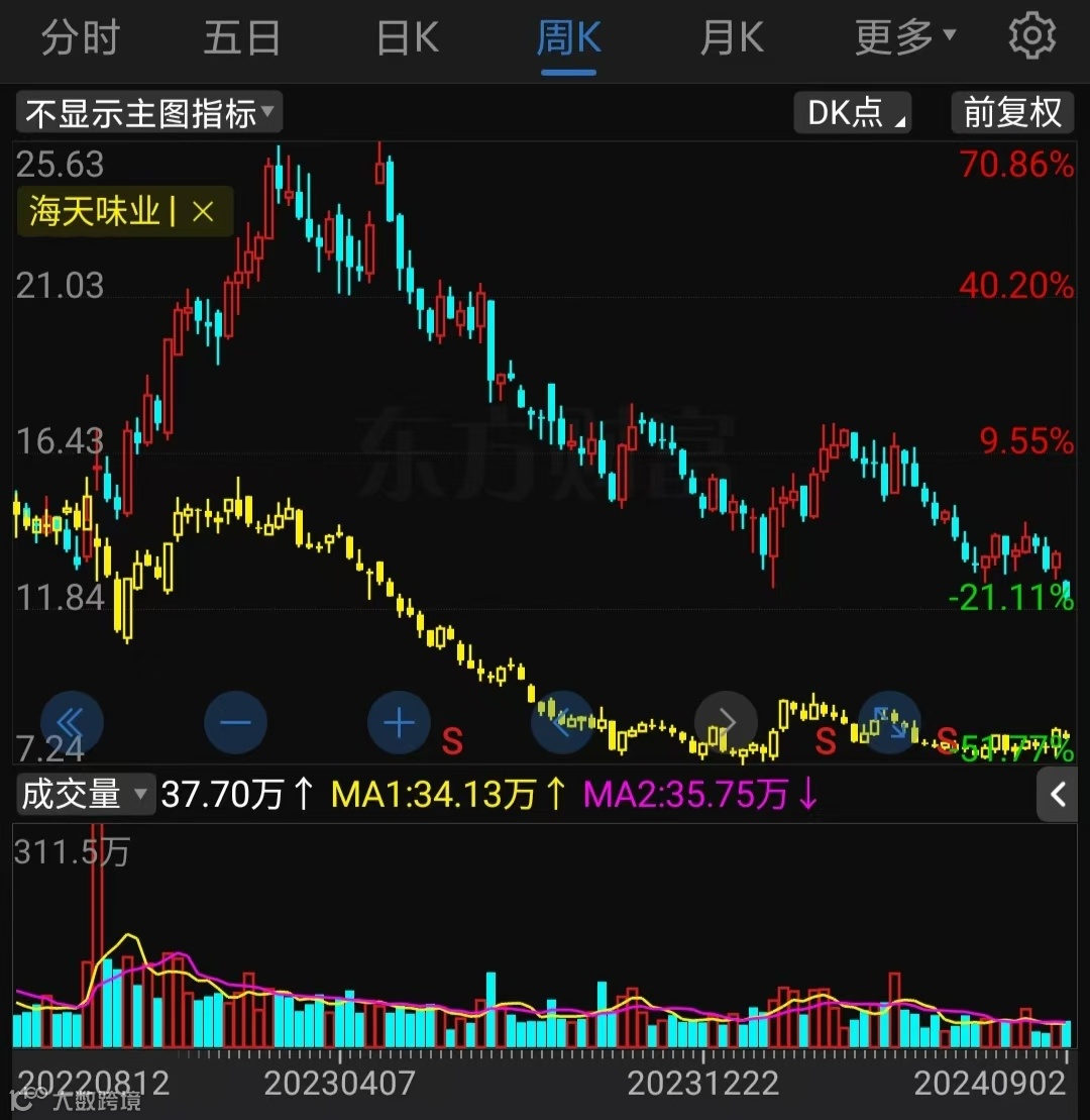 虽然大部分时间海天味业与千禾味业股价走势趋同,但最终结果却相差很大,从2022年8月以来,海天味业股价累计跌超50%,千禾味业跌幅为21%左右。