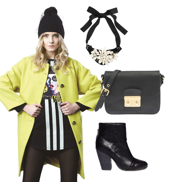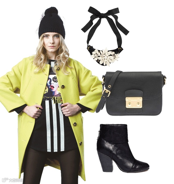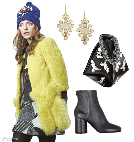 7.鲜艳的亮黄色皮草搭配冬装,摆脱冬天暗色的沉重感。