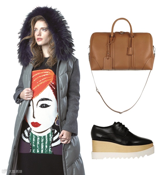 4.本款灰色羽绒服采用高质感可水洗羊皮和蓝色呢料面料拼接而成,廓型简洁,线条利落,深深浅浅的灰色服饰瞬间为瞬息万变的潮流中注入了一股冷静而优雅的力量。