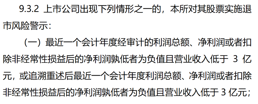 今年4月上交所修订后的相关规定要求,“利润总额、净利润或扣除非经常性损益后的净利润孰低者为负值且营业收入低于3亿元”将被实施退市风险警示,连续两个会计年度出现则强制退市。
