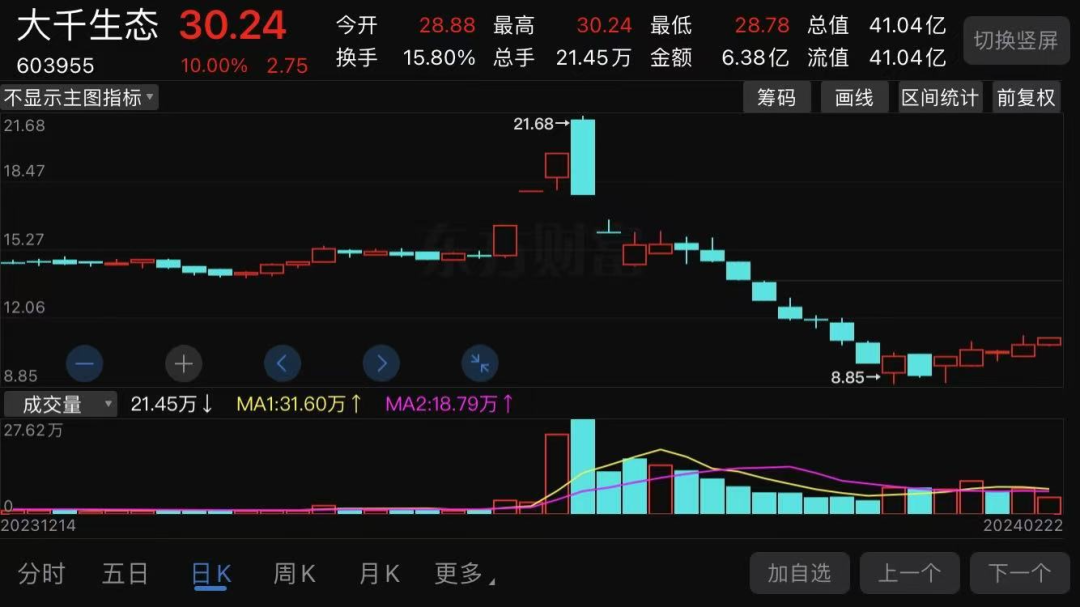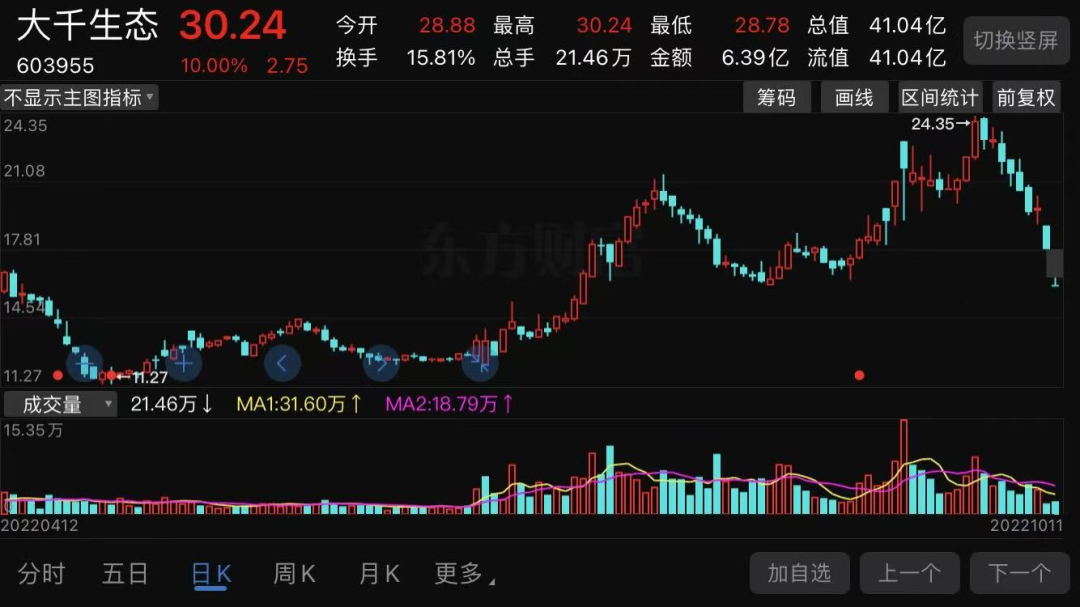 近期A股市场较前期持续的上涨出现了一定的调整,妖股涨停板的高度也有所下降,唯有市值不到50亿的大千生态股价已经连续12个涨停板,股价较9月底已经暴涨近4倍。