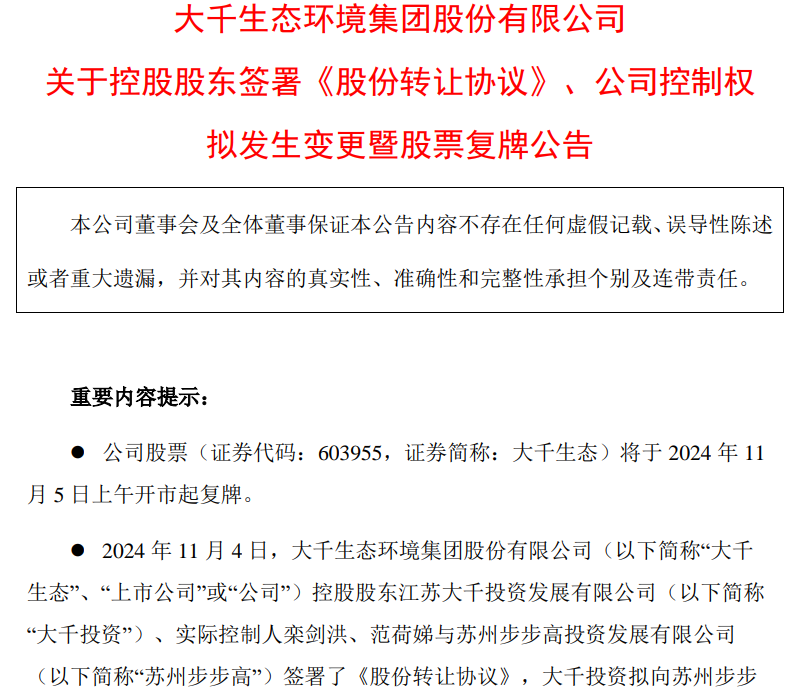 停牌一天后,11月5日大千生态复牌并发布《股权转让协议》,控股股东大千投资、实控人栾剑洪、范荷娣与苏州步步高签署《股权转让协议》,大千投资拟向苏州步步高协议转让其持有的2454.89万股股份、占总股本的18.09%,转让价格15元/股,总价款3.68亿。若本次交易完成后,控股股东将由大千投资变更为苏州步步高,实控人变更为张源。