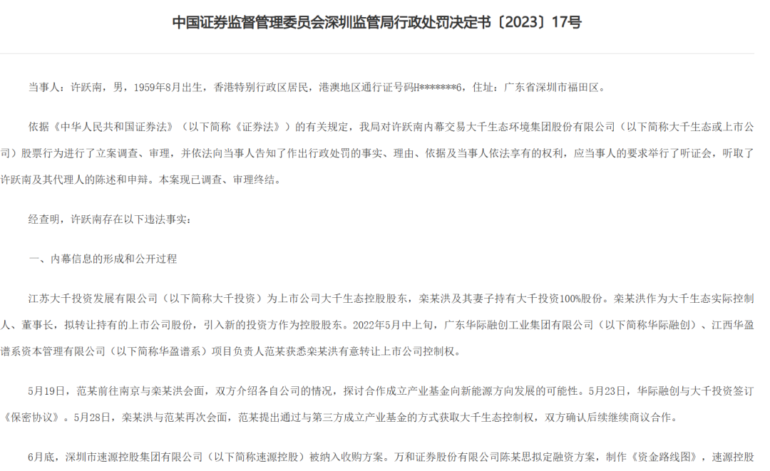 事实上,自2022年9月第一次筹划转让控制权以来,大千生态就屡次遭到行政处罚。特别是今年1月份出现的股价疑似内幕交易的情况,事后证明确实存在内幕交易,速源控股法代兼执行董事内幕交易大千生态,非法获利175.36万,被处没一罚三,并就其建议他人买卖的行为处以90万罚款,共计罚没791.47万。