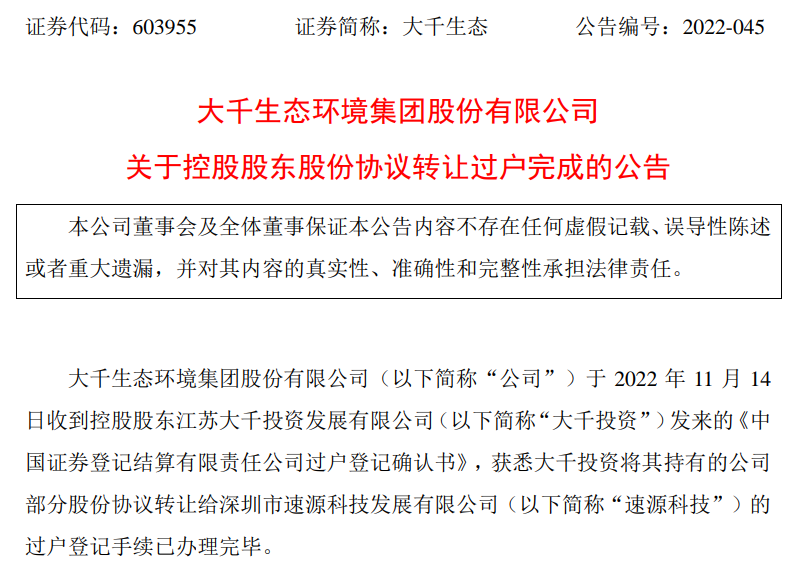 结果,到2022年10月28日,大千生态又扔出一份终止控制权转让并重签转让协议的公告,受让方拟减少受让比例,不涉及控制权变更。新的协议约定,大千投资拟向速源科技转让1044.49万股股份,占总股本的7.6959%,转让价格23.21元/股,总价款2.42亿。