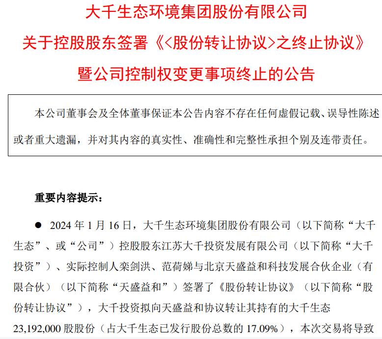因此,今年1月16日,大千生态又筹划控制权变更事项,本来公告只停牌一天,结果到1月18日才复牌。