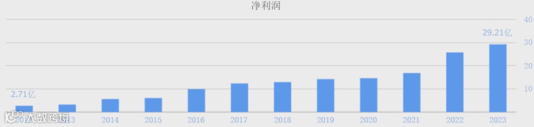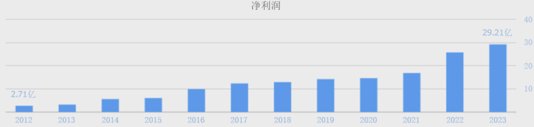 净利润方面,2012年三花智控净利润2.71亿,到2023年为29.21亿,11年增长了10倍,较18年前2005年的4476.42万则已经暴涨了64倍。