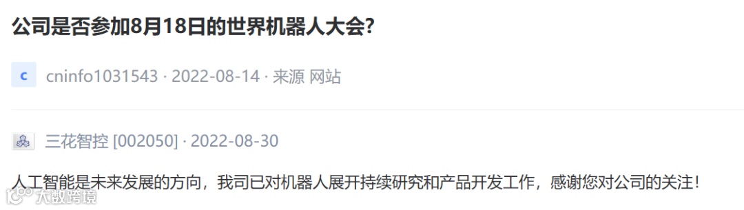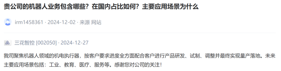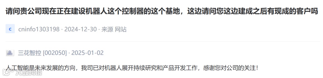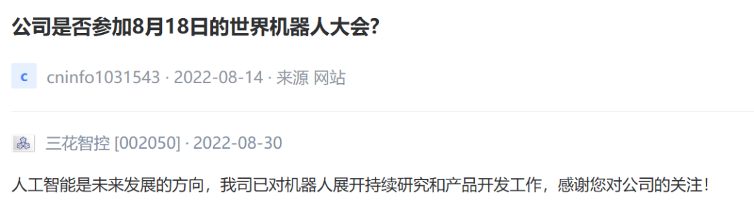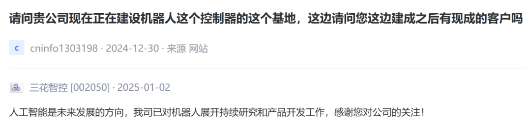 但是到了本月初的时候三花智控依然还是那句“人工智能是未来发展的方向,我司已对机器人展开持续研究和产品开发工作”。
